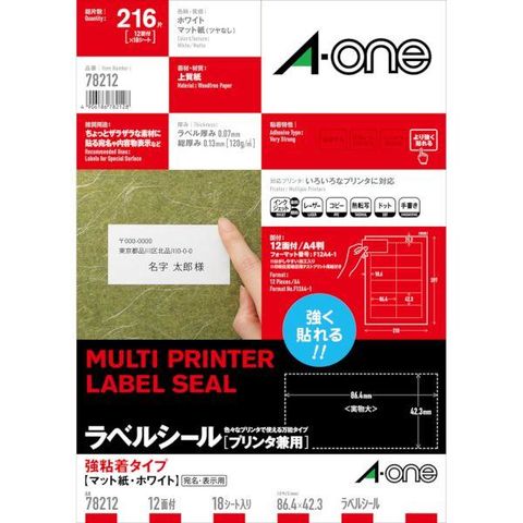 A-one エーワン 78212 ラベルシール プリンタ兼用 強粘着タイプ A4判 12面 四辺余白付 18シート