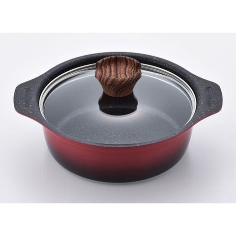 ●食品衛生法適合。●土鍋より軽い!こびりつきにくい!毎日使いたくなる卓上鍋です。 【仕様】●材質●本体:アルミニウム合金●底面:ステンレス鋼●内面:内面:ふっ素樹脂加工(マーブル)●外面:焼付塗装●蓋:強化ガラス/フェノール樹脂●荷姿サイズ:250×210×105 mm 760 g