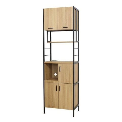 スチールと木目調の組み合わせ。スタイリッシュで、圧迫感のないデザインです。凹凸のあるエンボス加工で高級感があり、合成樹脂ですのでキズがつきにくく、お手入れが簡単です。使う時だけ引き出せるスライド棚は、蒸気のでる炊飯器やケトルなどの使用に最適です。オープンスペースにはキッチン家電も置けます。●可動棚大1枚(上扉6.4cmピッチ3ヶ所)、可動棚小3枚(中扉・左下扉・右下扉6.4cmピッチ3ヶ所)●1500W2口コンセント付●コード穴直径約5cm/合成樹脂化粧繊維板、スチール/組立式/生産国:中国キッチン収納・スチール・スタイリッシュ