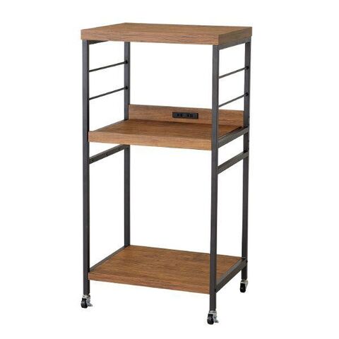 スチールと木目調の組合せ。スタイリッシュで圧迫感のないデザインです。天板・棚板は、凹凸のあるエンボス加工で高級感があり合成樹脂ですので傷がつきにくいです。●材質:合成樹脂化粧繊維板、スチール●生産国:中国●1500W2口コンセント●板厚:天板=約3.8cm、地板=約3cm●キャスター4ヶ(ストッパー付2ヶ)●仕様:組立式●1500W2口コンセント●板厚:天板=約3.8cm、地板=約3cm●キャスター4ヶ(ストッパー付2ヶ)キッチン・ワゴン・スチール