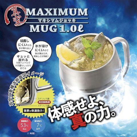 ●仕様:保温効力/53度以上(1時間)、保冷効力/7度以下(1時間)NMJ-1000 真空マキシマムジョッキ1.0L