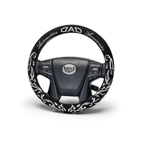純正ステアリングを外さずに上から被せるだけの簡単装着。●アラベスクデザイン&D.A.D ロゴ刺繍: