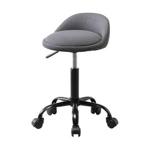 キャスターの付いた可愛いファブリックのチェア。背もたれが低いので机の下に入れ込むこともでき、圧迫感も少なくなっています。デスク前からキッチン周りなどいろいろな場所で活躍します。