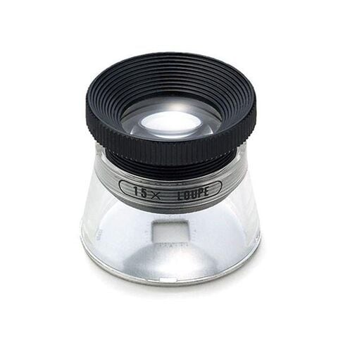 15倍の高倍率ルーペ。アルミプレートに0.1mm刻みのスケールが印刷されており、印刷物の検査、細かい平面物の測量に便利です。