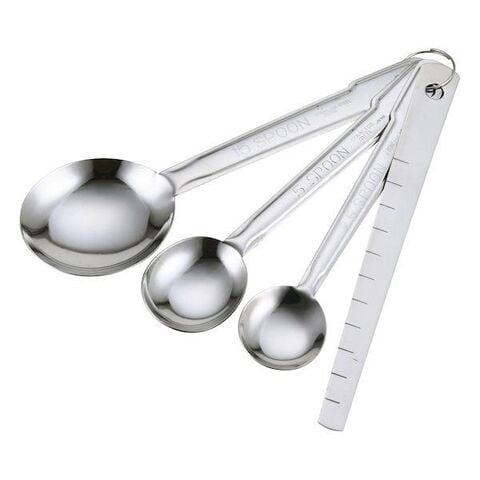 ●大さじ1(15ml)・小さじ1(5ml)・小さじ1/2(2.5ml)の3本に、すりきりヘラがついたステンレス製の計量スプーンセットです。