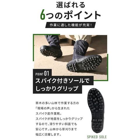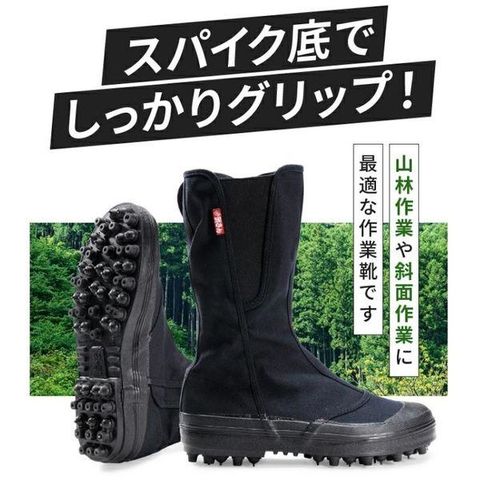 ゴムを内蔵し、踵がホールドされ足がブレにくい、踵ガード。スパイク付きで林業作業、草刈りなどで履いても安心。内側ファスナーで大きく開いて脱ぎ履きしやすい。