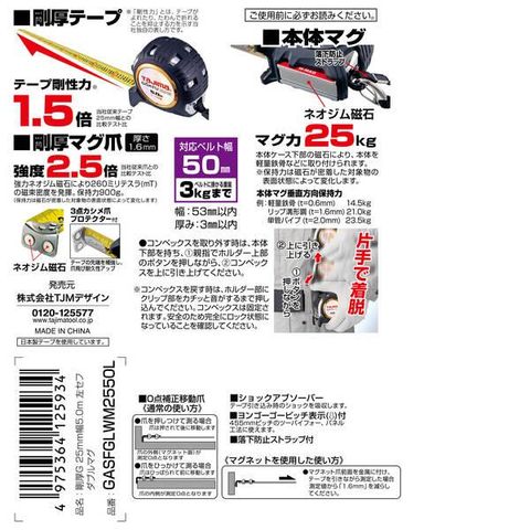 ティージェーエムテ GASFGLWM2550L タジマ 剛厚G 25mm幅5.0m 左セフダブルマグ爪 GASFGLWM2550L