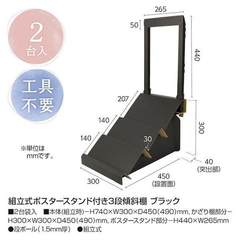 ササガワ タカ印 44-8898 組立式ポスタースタンド付き傾斜棚ブラック 448898 2入