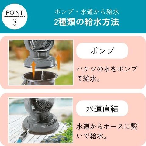 ●バケツの汲み上げと水道直結の2種類の給水方法です。