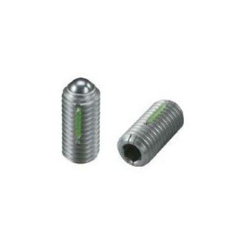 | 特徴 | ●ネジ部本体にスプリングを内蔵し、押し圧によってボールをストロークし位置決めします。 ●ロングロックが緩み防止になります。 |