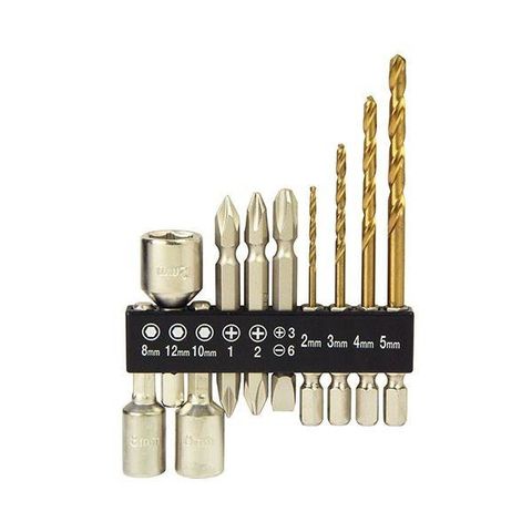 ネジ・ビスの締め付けができるビットと、ボルト・ナットの締め付けができるソケットと、鉄・木・樹脂の穴あけができるドリルの便利なセットです。