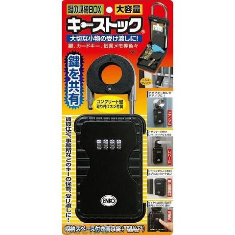 ●従来品には無い大容量の収納力、大型の自動車キーやカードキー、種類によっては複数の鍵を一度に収納可能。施錠・解錠はダイヤル式でキーは不要、暗証番号は可変式で任意の番号にセット可能。設置場所はドアノブにかけてと、壁にビス止め(御希望の場合・施工はお客様で)の2通りの方法が可能。伝言メモ紙やメモリースティック等の一時保管・受け渡しに賃貸住宅・事務所等の鍵管理、受け渡しに。住宅展示場等、不動産業の物件管理に、緊急時、御家族への鍵の受け渡しに