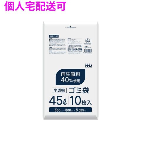 【個人宅配送可】ポリ袋 45L HDPE 0.025×650×800 半透明 10枚×80冊(800枚) EH48【取り寄せ商品・即納不可・代引き不可・返品不可】