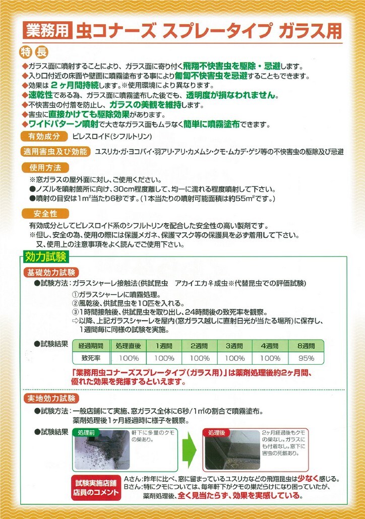 | 商品名 | 業務用 害虫忌避剤 虫コナーズ スプレータイプ ガラス用 |