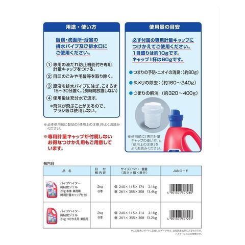 花王 パイプハイター 高粘度ジェル 業務用 本体 専用軽量キャップ付き 2kg×6本入【取り寄せ商品・即納不可・代引き不可・返品不可】