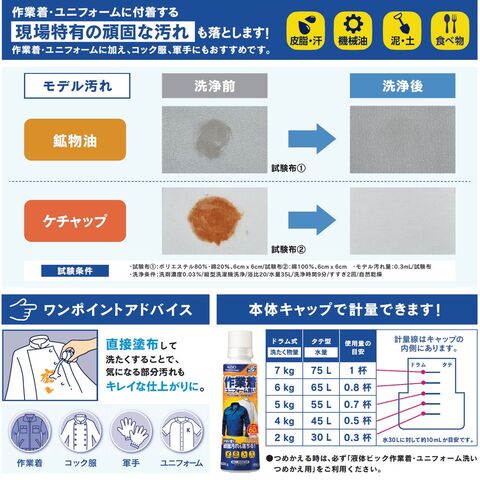 ●現場特有の頑固な汚れも落とします!皮脂・汗、機械油、泥・土、食べ物汚れに。