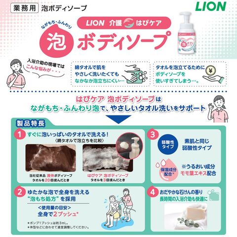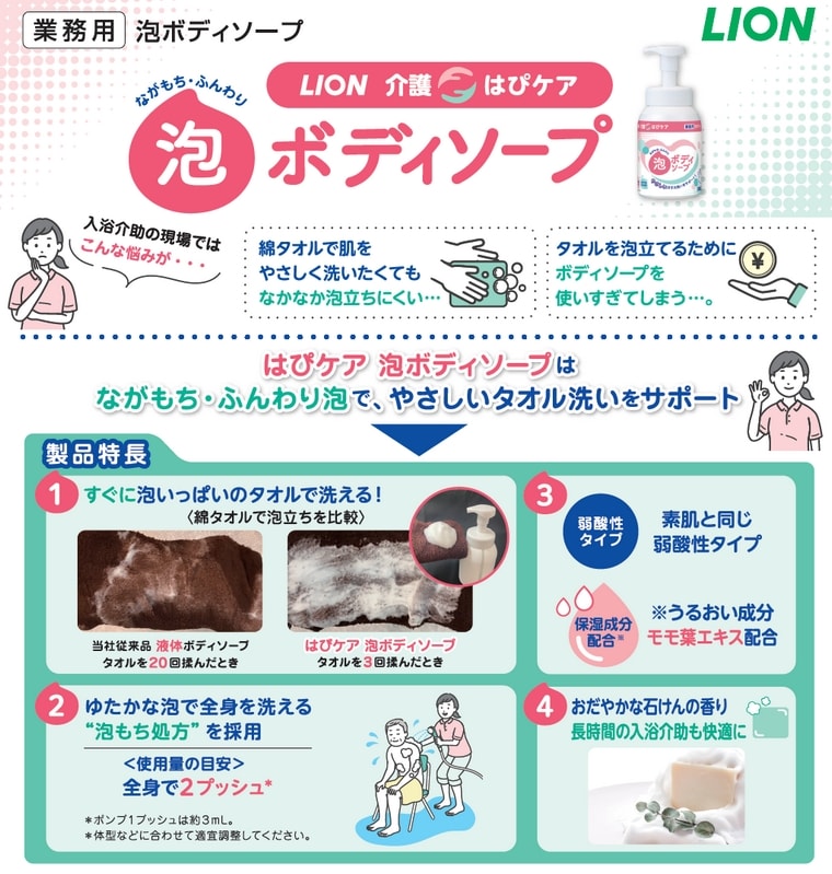 LION 業務用 ながもち・ふんわり泡で、やさしいタオル洗いをサポート!介護施設向け
