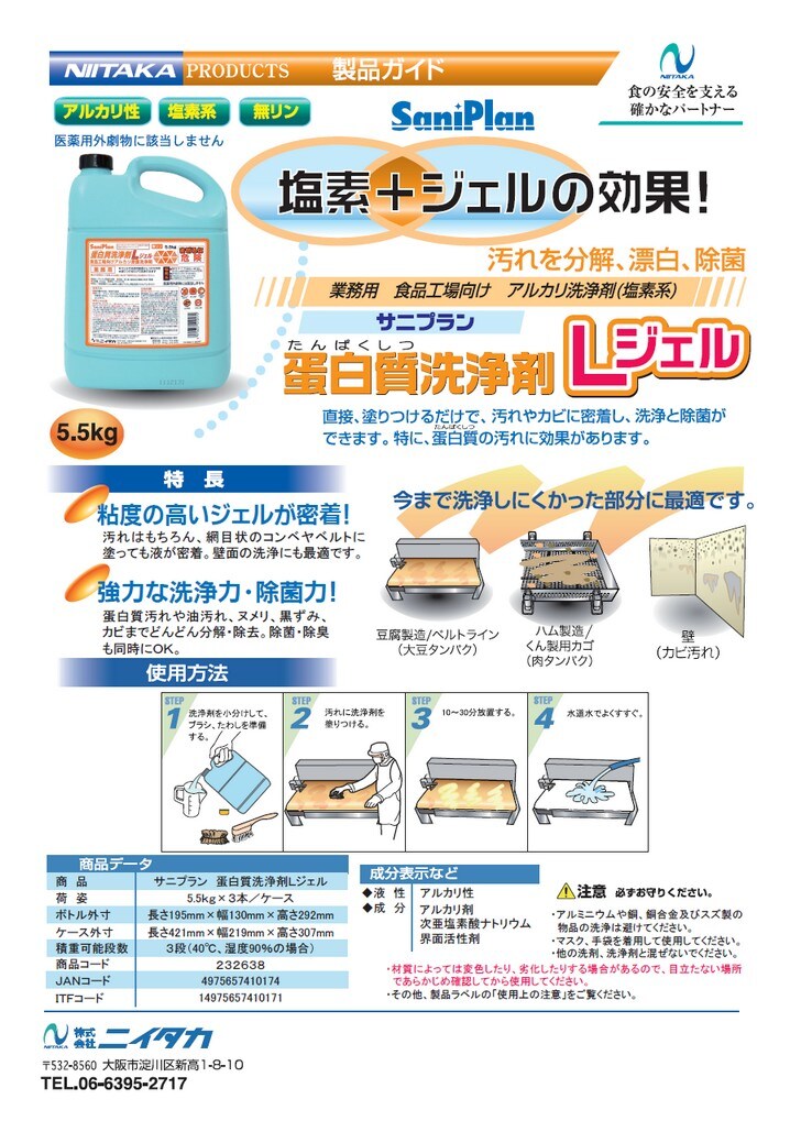 | 商品名 | 業務用 アルカリ洗浄剤(塩素系) サニプラン タンパク質洗浄剤Lジェル | |
