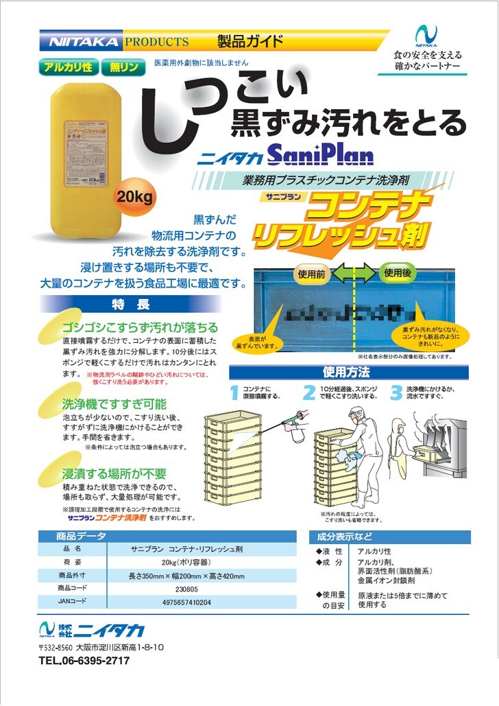 | 商品名 | 業務用 プラスチックコンテナ洗浄剤 サニプラン コンテナリフレッシュ剤 |