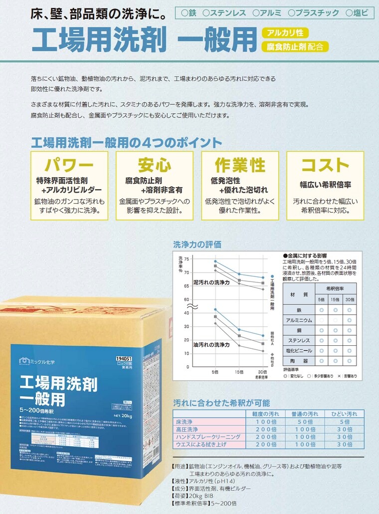 ハードな鉱物油汚れを強力に除去。工場の床、壁、部品類の洗浄に最適