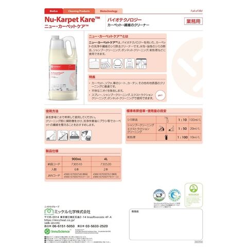 ●バイオテクノロジーを用いた、カーペットの洗浄や繊維のシミ除去クリーナー。