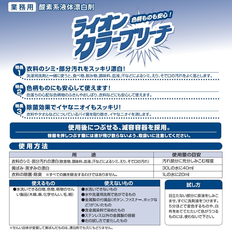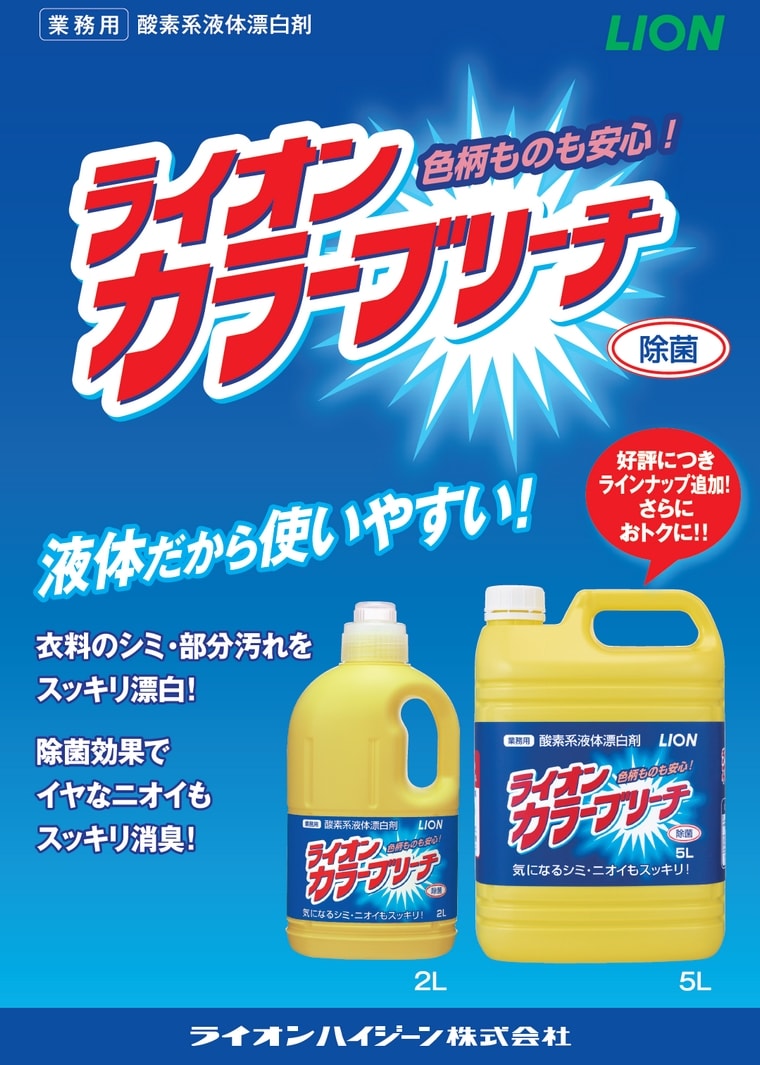 LION 業務用 色柄物も安心!液体の衣料用酸素系漂白剤。除菌効果で消臭も