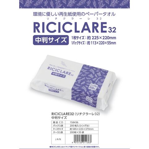 | 商品名 | 業務用 ペーパータオル RICICLARE32 (リチクラーレ32) シングル 中判サイズ |