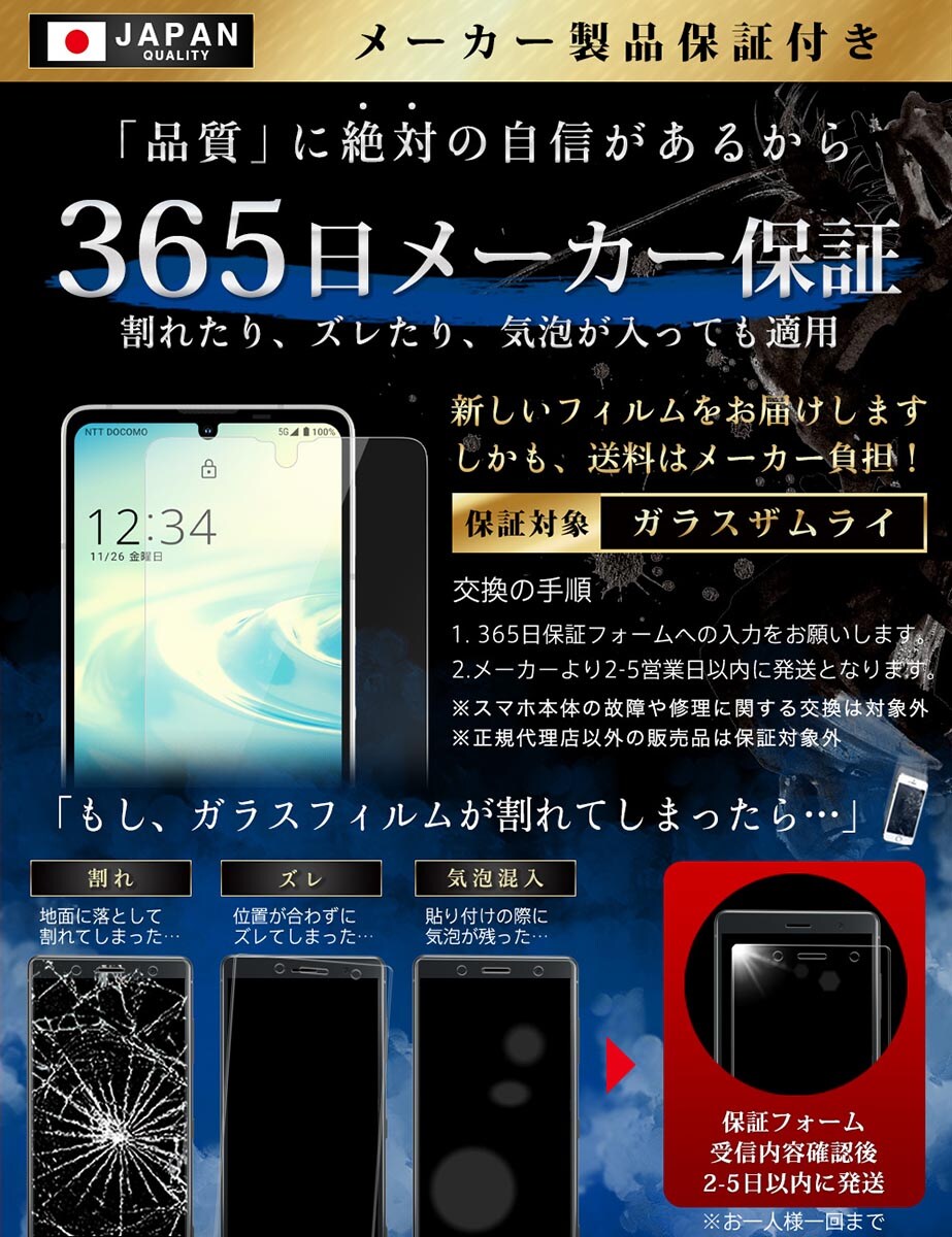 商品名:AQUOS sense6s / sense6 ガラスフィルム 保護フィルム ブルーライトカット 10H ガラス ガラスザムライ らくらくクリップ付き フィルム