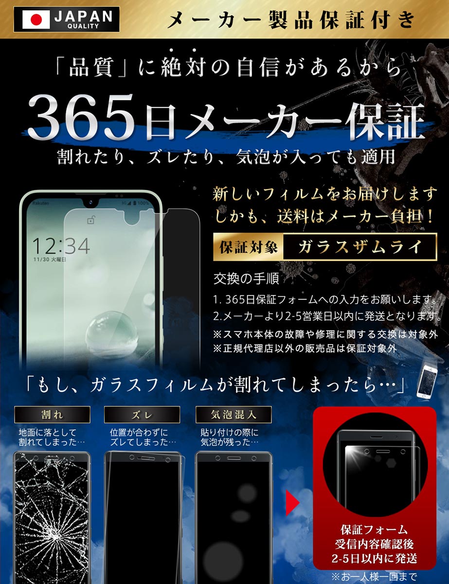 ガラスザムライは製造方法と素材を徹底して追求。 更に、270℃で1時間、410℃で5.5時間。+1時間の冷却をして、約6.5時間かけて ”割れないガラスフィルム” を実現しています。