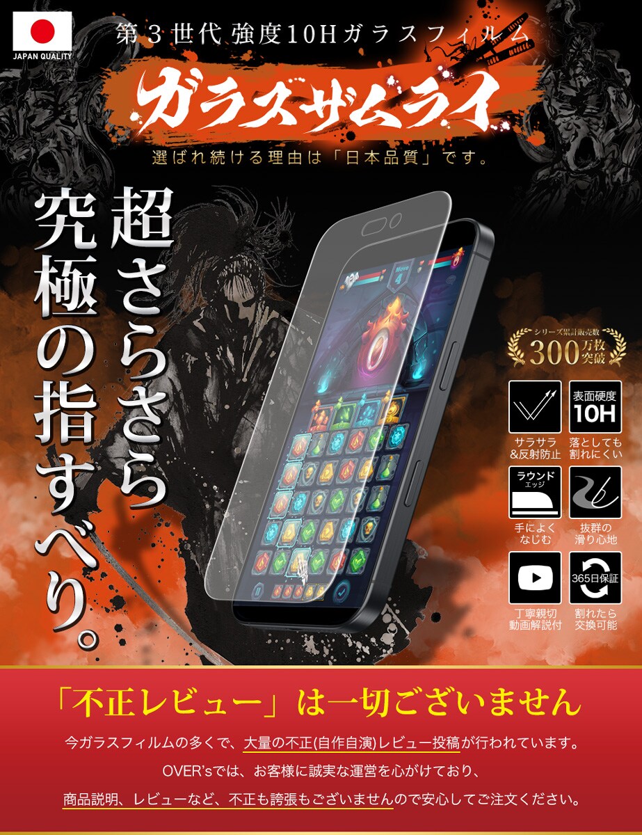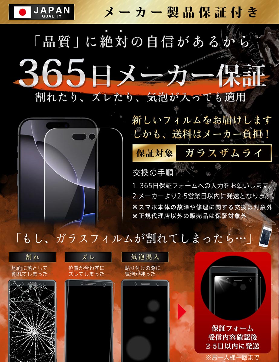 ガラスザムライは製造方法と素材を徹底して追求。 更に、270℃で1時間、410℃で5.5時間。+1時間の冷却をして、約6.5時間かけて ”割れないガラスフィルム” を実現しています。