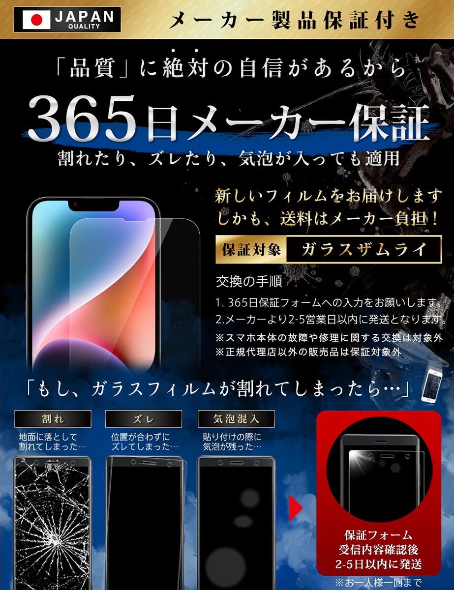 ガラスザムライは製造方法と素材を徹底して追求。 更に、270℃で1時間、410℃で5.5時間。+1時間の冷却をして、約6.5時間かけて ”割れないガラスフィルム” を実現しています。