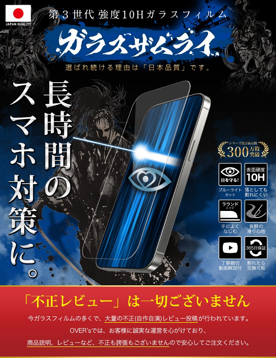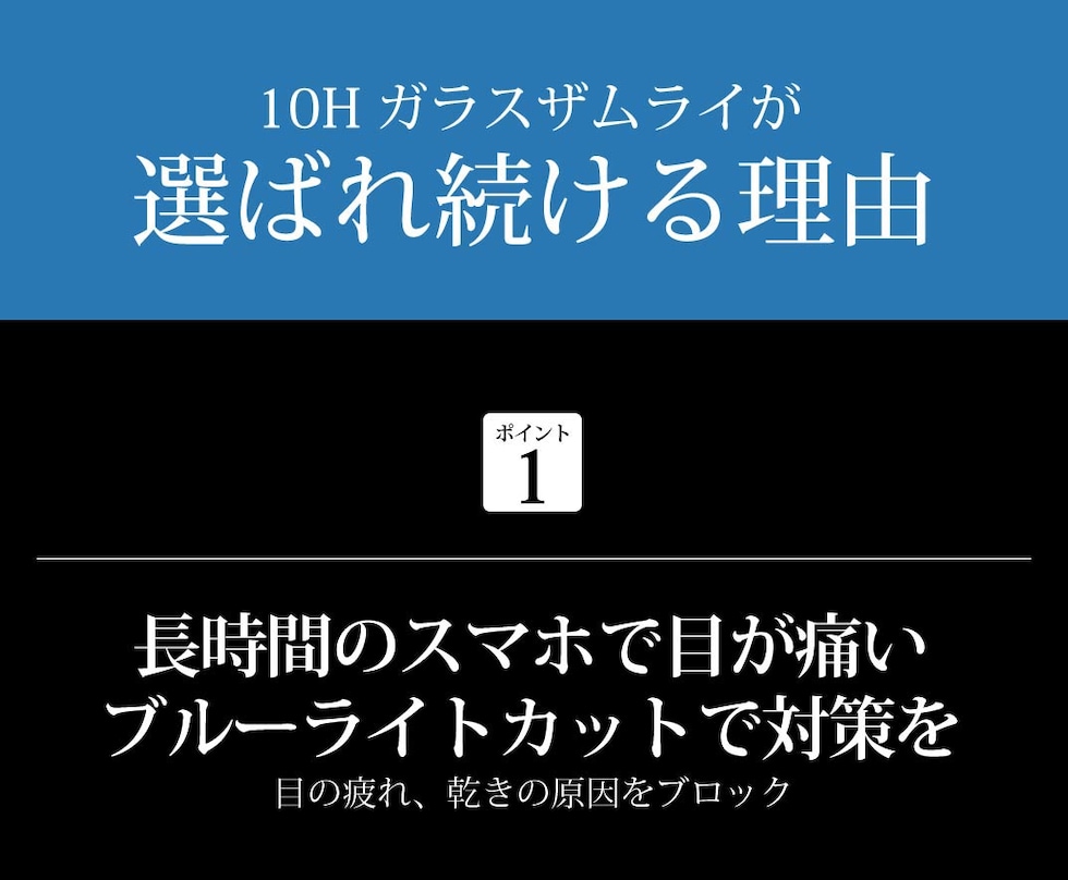 移動中の電車で、寝る前の暗闇で、ゲームのやりすぎで、ブルーライトを浴び続けると「目の痛み」「肩こり」「頭痛」を引き起こし、体全体に悪影響を与えます。 今日からできる "ブルーライト対策" を、ガラスザムライで。