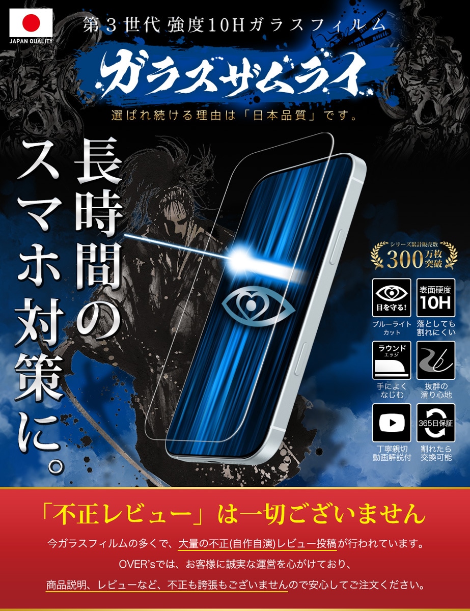 移動中の電車で、寝る前の暗闇で、ゲームのやりすぎで、ブルーライトを浴び続けると「目の痛み」「肩こり」「頭痛」を引き起こし、体全体に悪影響を与えます。 今日からできる "ブルーライト対策" を、ガラスザムライで。
