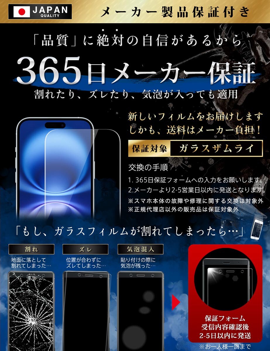 ガラスザムライは製造方法と素材を徹底して追求。 更に、270℃で1時間、410℃で5.5時間。+1時間の冷却をして、約6.5時間かけて ”割れないガラスフィルム” を実現しています。