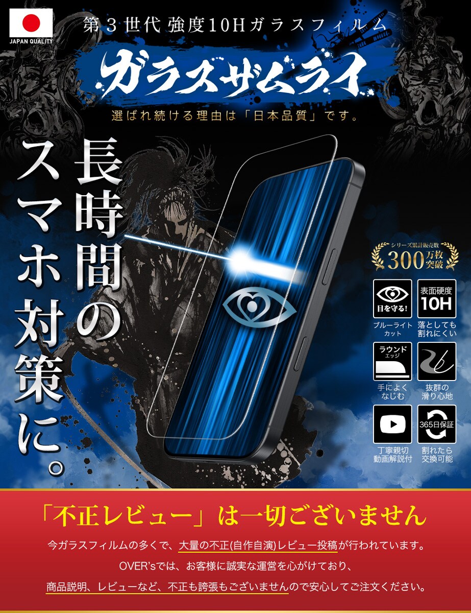 移動中の電車で、寝る前の暗闇で、ゲームのやりすぎで、ブルーライトを浴び続けると「目の痛み」「肩こり」「頭痛」を引き起こし、体全体に悪影響を与えます。 今日からできる "ブルーライト対策" を、ガラスザムライで。