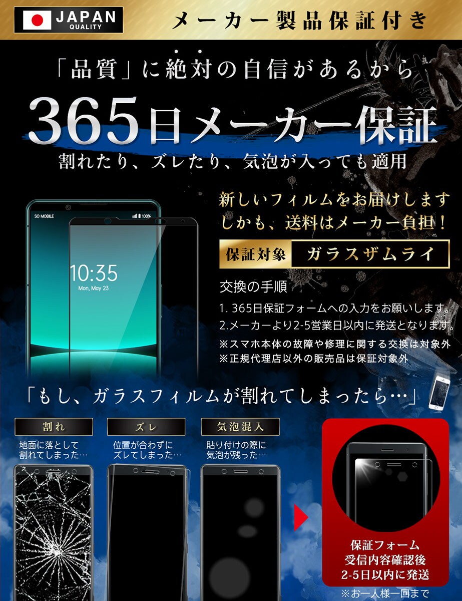 ガラスザムライは製造方法と素材を徹底して追求。 更に、270℃で1時間、410℃で5.5時間。+1時間の冷却をして、約6.5時間かけて ”割れないガラスフィルム” を実現しています。