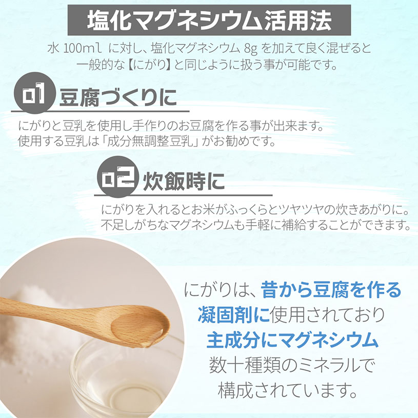 用途:にがりとして豆腐作りに、スポーツ飲料のマグネシウム源としても使用されています。