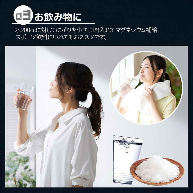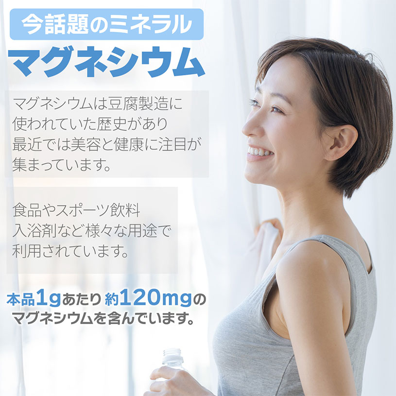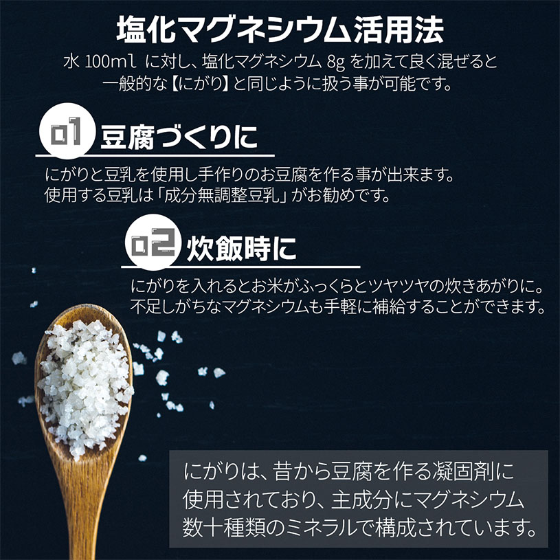 用途:にがりとして豆腐作りに、スポーツ飲料のマグネシウム源としても使用されています。