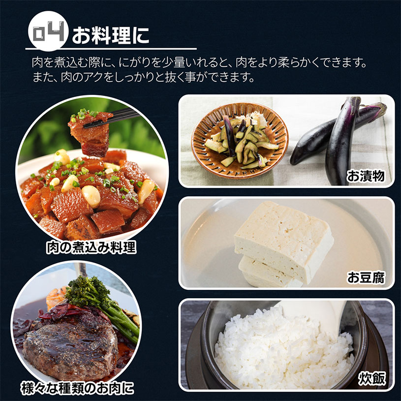 | 用 途 | にがりとして豆腐作りの凝固剤。お漬物・炊飯などの風味向上。肥料等の製造。 |
