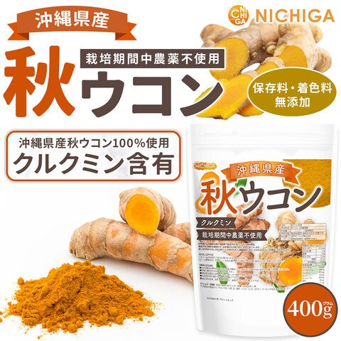 沖縄県産 秋ウコン 400g 【送料無料】【メール便で郵便ポストにお届け】【代引不可】【時間指定不可】 クルクミン含有 栽培期間中農薬不使用 秋ウコンを100%使用 ミネラルが豊富 [05] NICHIGA(ニチガ) 残留農薬実施済み