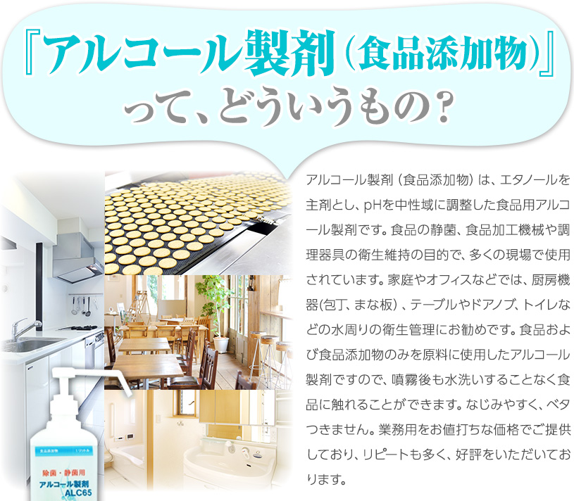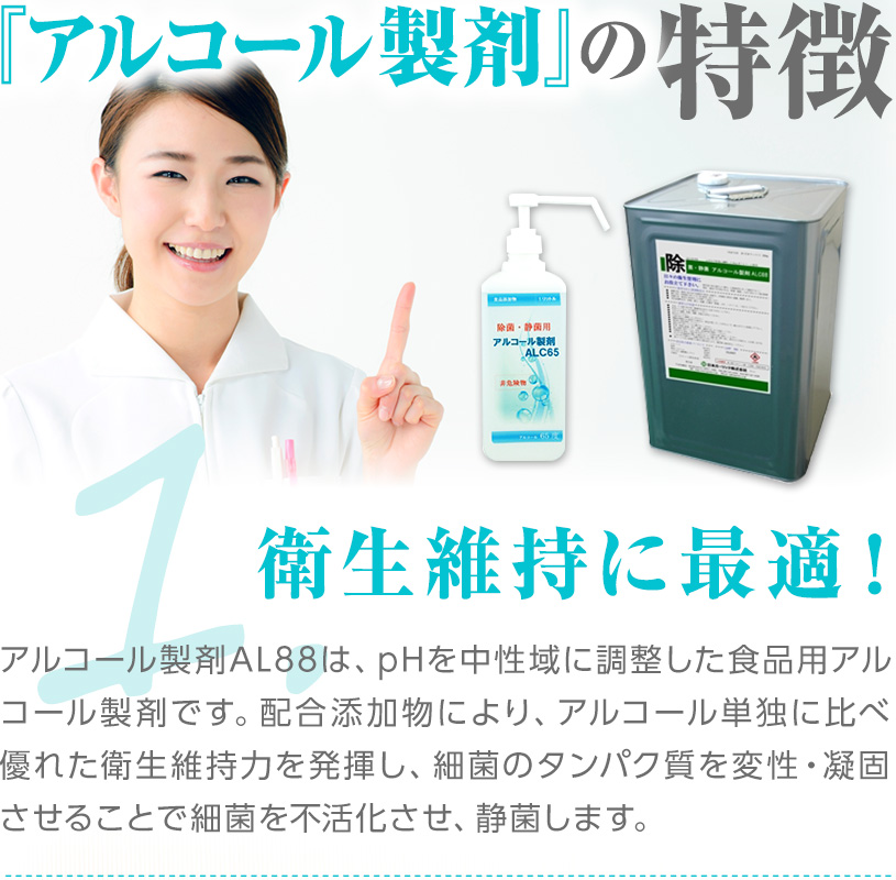 | 特 徴 | アルコール製剤AL88は、pHを中性域に調整した食品用アルコール製剤です。 |