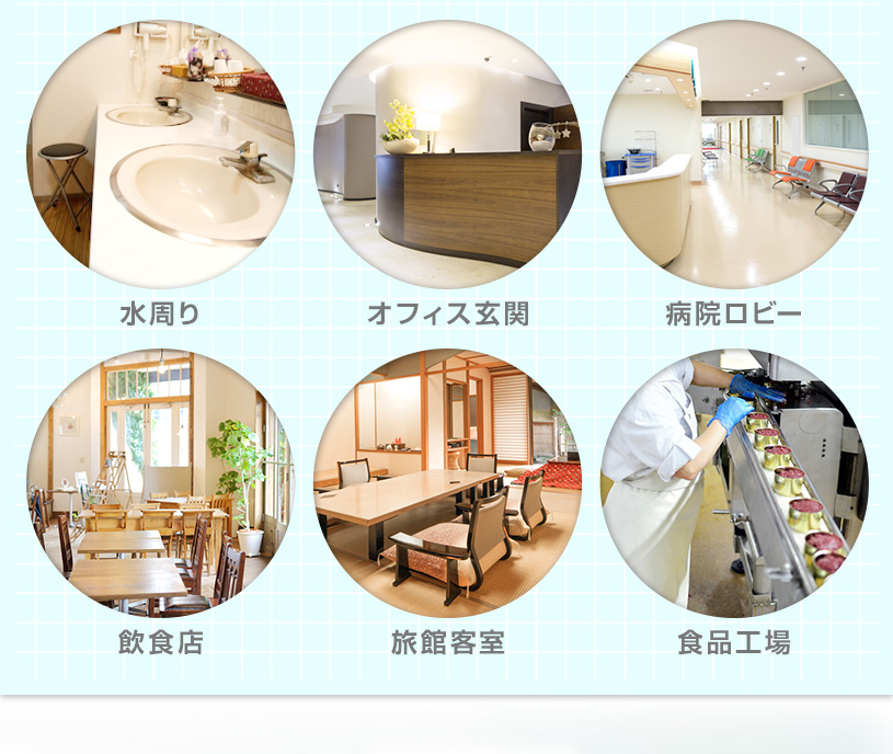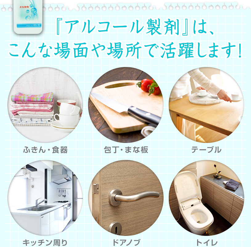 厨房機器(包丁・まな板)、テーブルやドアノブ、トイレなどの水周りの衛星管理にお役立てください。