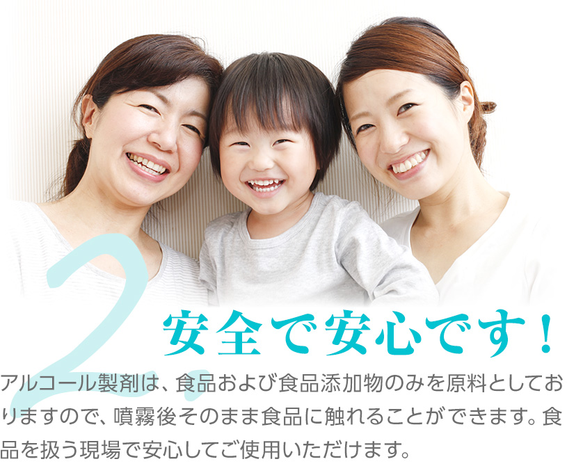 食品および食品添加物のみを原料とした中性タイプの低濃度アルコール製剤です。噴霧後そのまま食品に触れることができます。