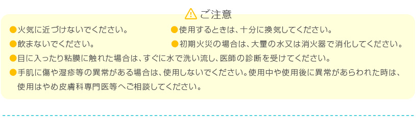 ○火気に近づけないでください。 ○使用の際は十分に換気してください。 ○飲まないでください。 ○初期火災の場合は、大量の水又は消火器で消化してください。 ○目に入ったり粘膜に触れた場合は、すぐに水で洗い流し、医師の診断を受けてください。 ○白木や桐、印刷面、ニス、水性ペンキ、ワックス、クリアコートなどの塗布面には使用しないでください。シミ、変色の原因となることがあります。 ○樹脂材料(アクリルなど)、ゴム材料、皮革材料、カシュー塗装品などに使用した時、溶解・亀裂・膨潤などの変化が起きる場合がありますので予め確かめてから使用してください。 ○手肌に傷や湿疹等の異常がある場合は、使用しないでください。 ○使用中や使用後に異常があらわれた場合は、利用を中止し医師に相談してください。 |