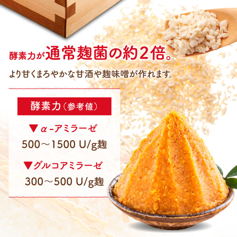 酵素力価が通常麹菌の約2倍もあるので、より甘くまろやかな甘酒や麹味噌が作れます。