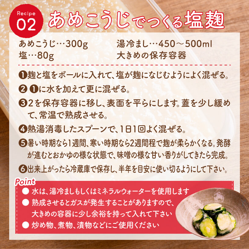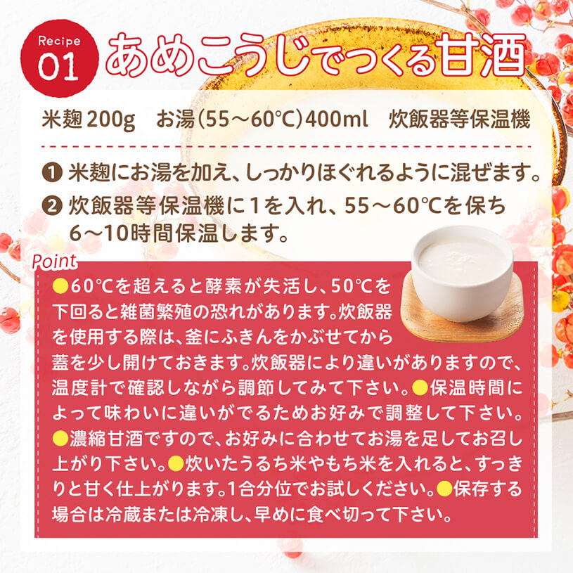 ○麹は非常に害虫がつきやすいためお買い上げ後は、冷蔵保存をお勧めします。 ○開封後は速やかにご使用ください。 ○開封後は湿気に注意してチャックをしっかり閉めて保存し、早めにお召し上がりください。 ○天産物を原料とした商品であり、着色料、香料を使用いたしておりません。そのため製造ロットにより風味が異なる場合がございます。予めご了承ください。 ○原材料名をご確認の上、食品アレルギーのある方は召し上がらないでください。 ○乳幼児の手の届かない場所で保管してください。 ○食生活は主食、主菜、副菜を基本に、食事のバランスを大事にしてください。 |