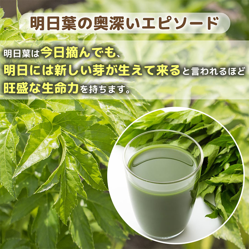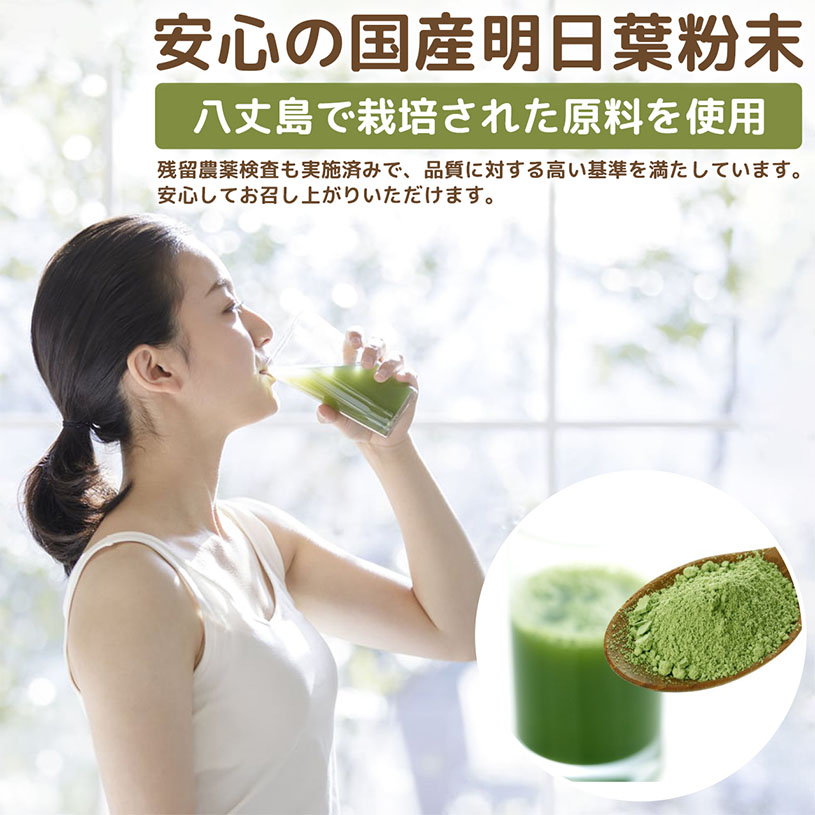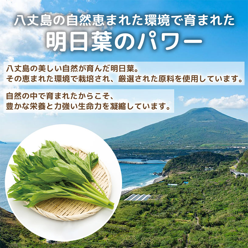 太陽と大地の恵みを受けてたくましく育った八丈島産明日葉を100%使用して、濃厚で鮮やかな緑色に富み、質の高い栄養を含んでいる青汁粉末に仕上げました。