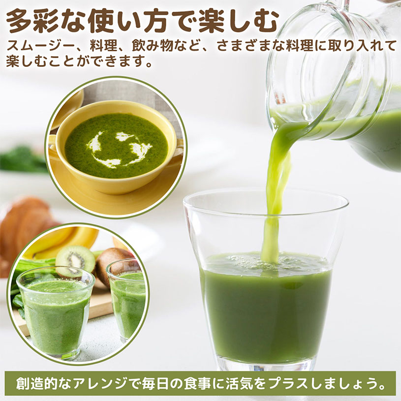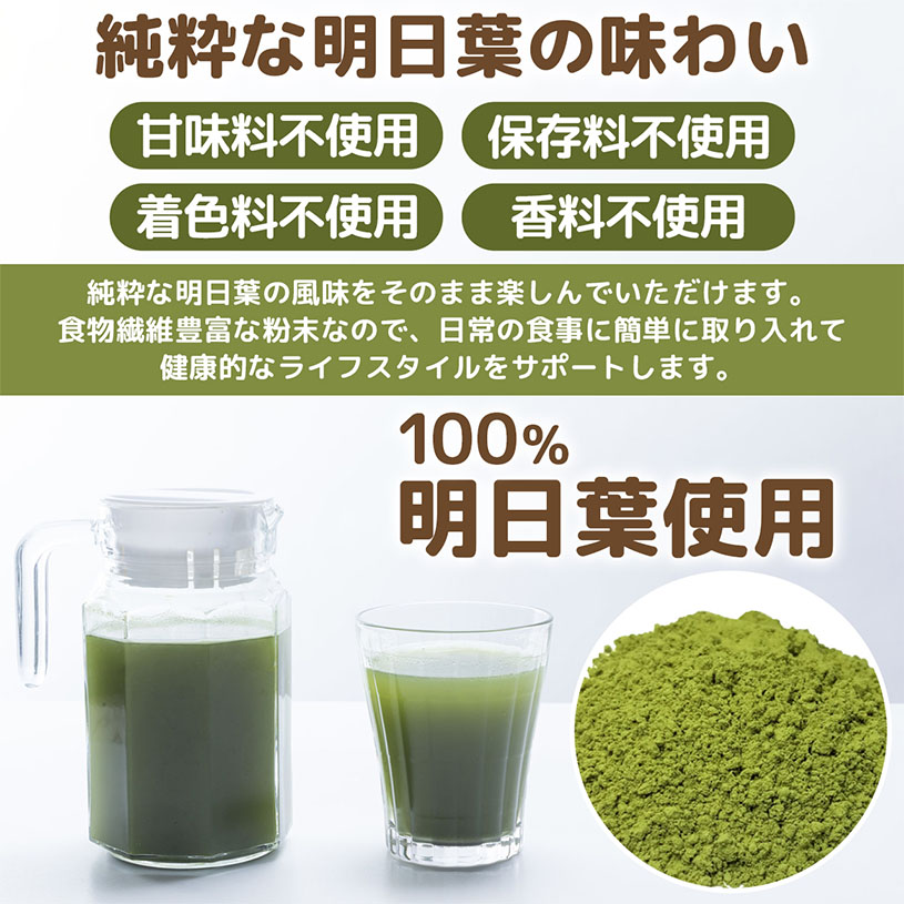 食物繊維豊富で、着色料・香料・甘味料を使わず、八丈島明日葉のめぐみをそのまま召し上がれるパウダーです。