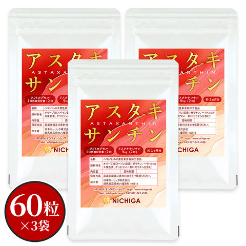 アスタキサンチン カプセル 約1ヵ月分×3袋 (約3ヵ月分) 180粒 【送料無料】【メール便で郵便ポストにお届け】【代引不可】【時間指定不可】ヘマトコッカス藻色素配合 サプリメント 1日2粒アスタキサンチン9mg [06] NICHIGA(ニチガ)