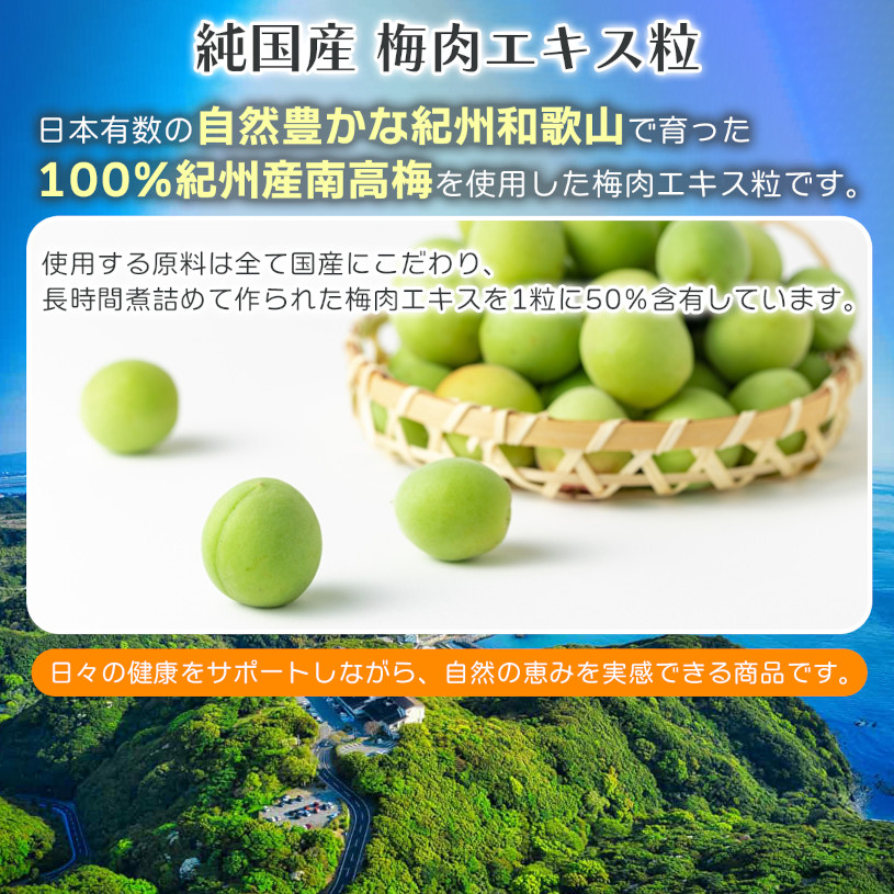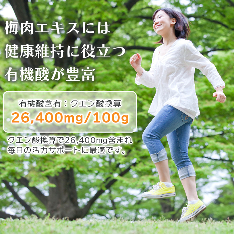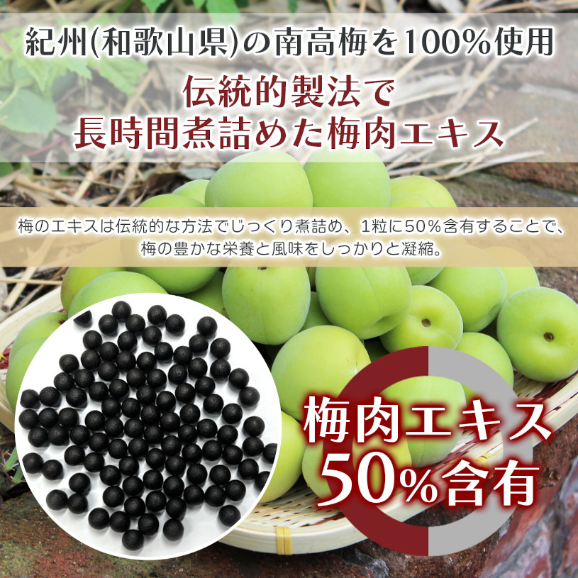 使用原料すべて国産にこだわり、伝統的な製法で長時間煮詰めて作られた梅肉エキスを1粒に50%含有。